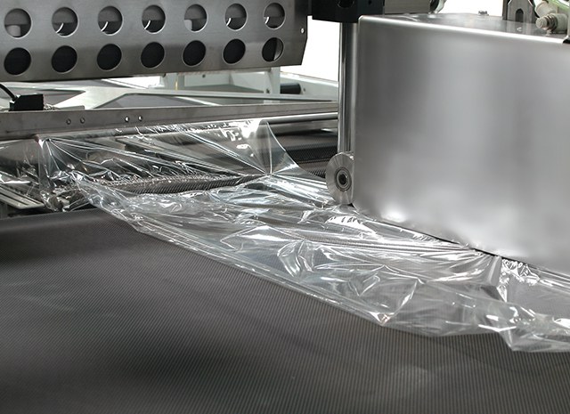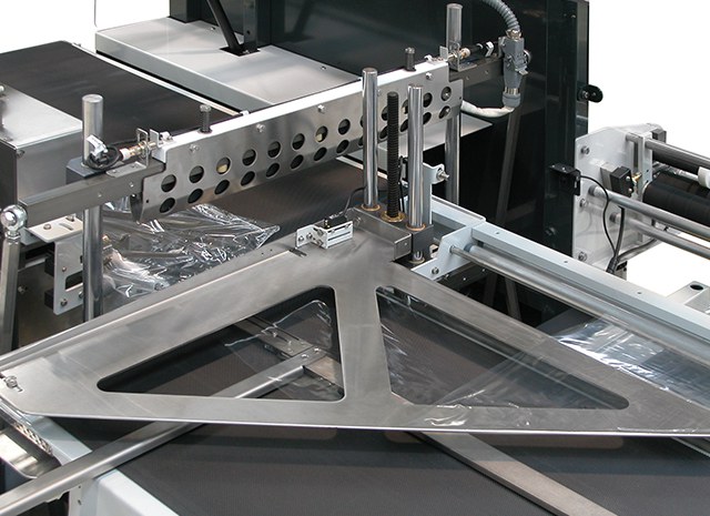 - Alimentazione automatica in linea mediante un nastro di trasporto, con separazione e allineamento del prodotto mediante regolazione manuale della fascia di film.