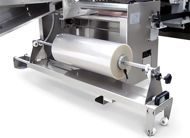 - Portabobina di facile accesso che consente di caricare facilmente bobine pesanti. E' dotato di un sistema motorizzato per lo sbobinamento del film, che ottimizza il funzionamento della macchina.