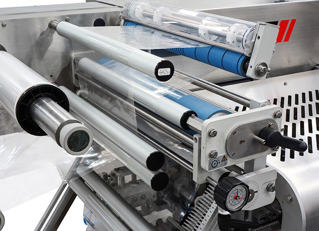 Tre coppie di rulli di svolgimento longitudinale, saldatura e piegatura di film.