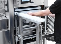 Macchina termosaldatrice automatica con disegno igienizzabile e dimensioni molte compatte per tutte le tipologie di vaschette preformate regolari. Possibilità di confezionamento in atmosfera modificata (MAP) e confezionamento sottovuoto. Sistema di trasporto di vaschette con palette per medie produzioni.