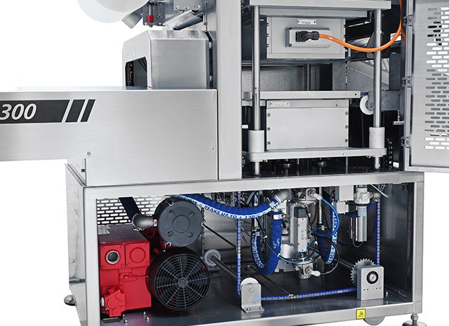 Macchina termosaldatrice compatta TSB 300, per il confezionamento di prodotti alimentari in vaschette preformate, chiuse con un film o coperchio termosaldabile.