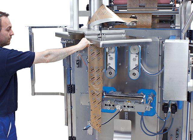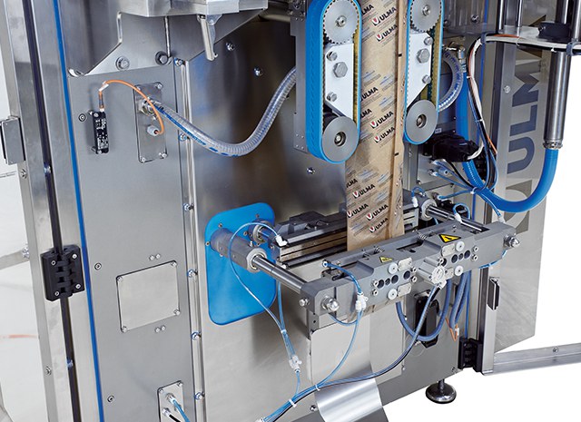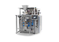 Macchina confezionatrice verticale (VFFS)con disegno igienico e cambio facile formato. Disegnata per il confezionamento in continuo ad alte velocità.