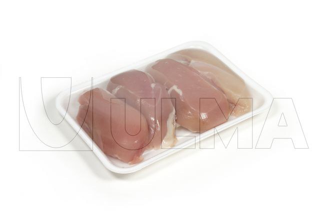 Confezionamento di pollo in vaschetta in espanso termosigillata con film SSF.