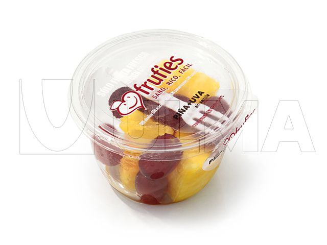 Confezionamento di frutta a pezzi pronta da mangiare in termosaldato con atmosfera controllata (MAP) La confezione include una forchetta tra il coperchio e il film termosaldato. 2071_1.jpg TSA 540 Termosaldatrice automatica per tutti i tipi di vassoi preformati con forma regolare. Possibilità di confezionare in atmosfera modificata (ATM)e con vuoto. Sistema di trasporto dei bracci. Per integrazione in linee automatiche e primi processi di automazione.
