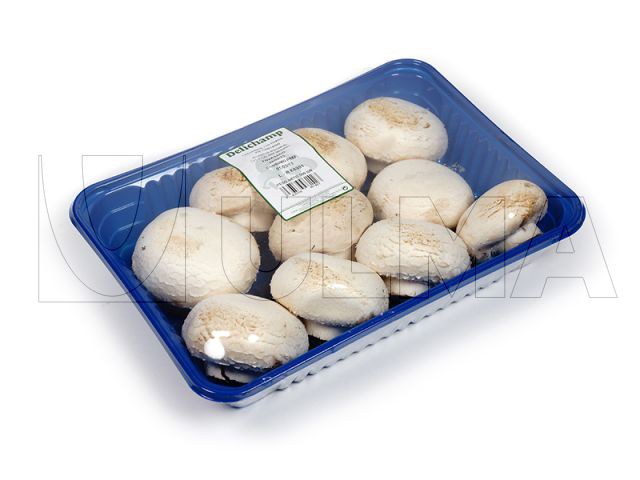 Confezionamento di funghi champignones in vaschetta termosaldata