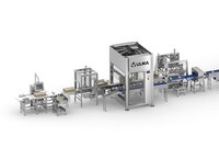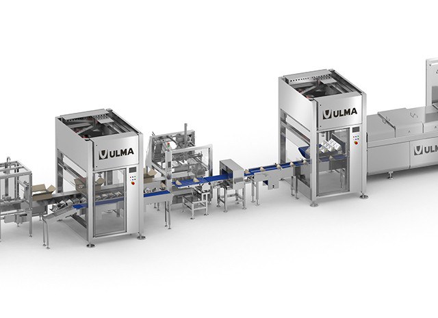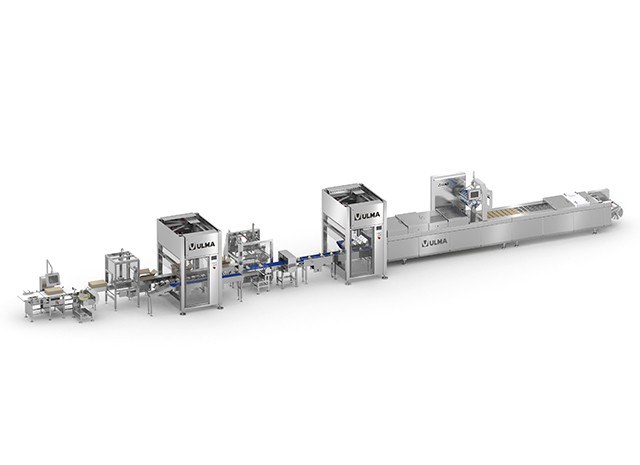 Linea completa di confezionamento totalmente automatizzata per il confezionamento di tranci di formaggio in termoformato flessibile.