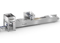 La prima fase della linea è il confezionamento sottovuoto di tranci di formaggio in confezioni termoformate e saldate sulla stessa macchina. Con il film superiore stampato, si realizzano confezioni in file da tre.