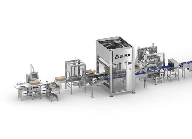 La cellula di inscatolamento riceve le casse di cartone vuote provenienti da una formatrice di cartone che forma le casse a partire dalla plancia.