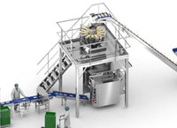 Il prodotto si eleva fino alla pesatrice multitesta combinata che realizza le dosi necessarie per ciascuna busta, trasferendo il prodotto alla confezionatrice verticale.
