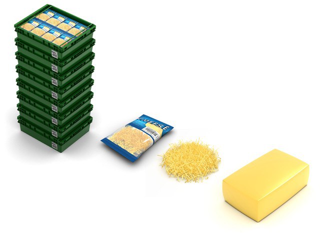La linea di confezionamento parte con una grattugia per il formaggio il cui risultato raccoglie un nastro che legge in modo automatico il flusso di formaggio ricevuto, aggiungendo antiagglomerante (normalmente fecola di patate) in proporzione corretta rispetto alla lettura del flusso di formaggio ricevuto.