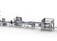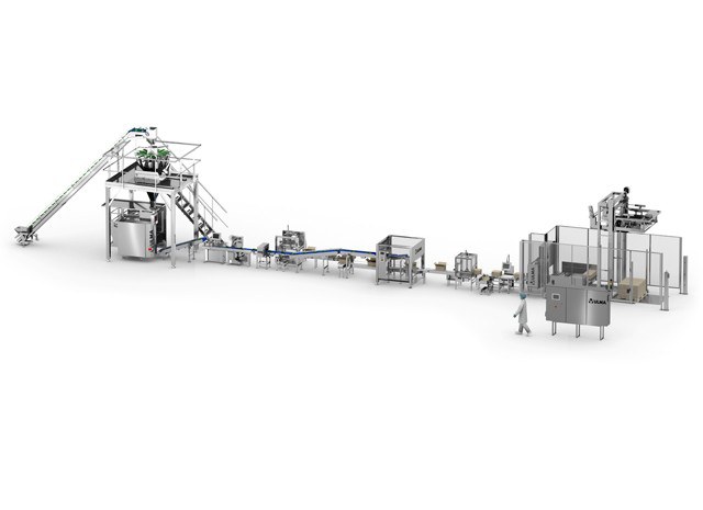 La line inizia con un elevatore di prodotto che alimenta il dosatore multitesta che realizza le dosi richieste affinchè la confezionatrice verticale realizzi la busta di prodotto congelato.