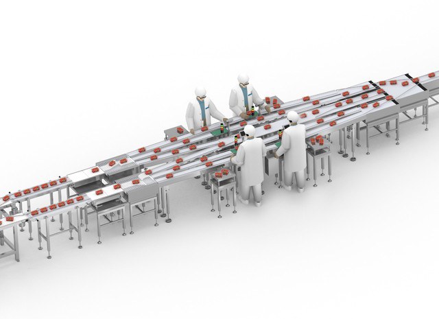 Il sistema di sblocco riceve i vassoi attraverso due nastri di alimentazione e introduce nella linea di confezionamento le vaschette su due nastri di trasporto.