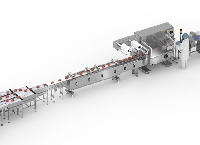 La macchina flowpack si occupa della realizzazione del confezionamento singolo di ciascuna vaschetta di fragole. Per questo motivo un alimentatore automatico si occupa di posizionare e ottenere l' esatta separazione tra i vassoi in modo tale che il flusso di processo sia ottimale.
