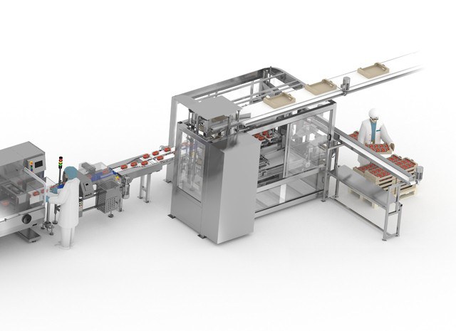 Il sistema di inscatolamento riceve le casse di cartone preformate e si occupa dell' inserimento in modo automatico delle vaschette confezionate in flow pack.