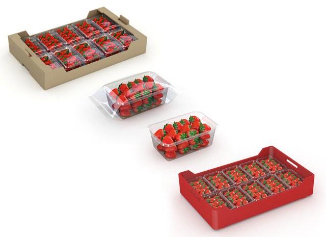 Le fragole arrivano in vaschette di plastica che a loro volta vengono inserite dentro una cassa di plastica. E' necessario realizzare il corrispondente spostamento per pesare e confezionare ciascuna vaschetta singolarmente.