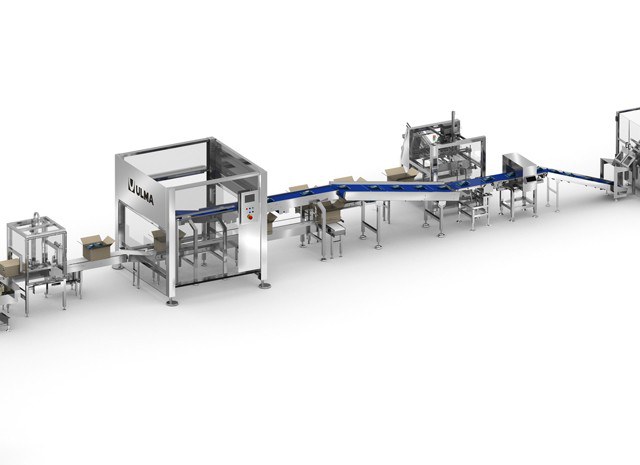 La linea è dotata di un formatore di scatole, cella di inscatolamento robotizzata e sigillatrice. Tutto questo perfettamente integrato nella linea affinchè il processo sia totalmente automatico.