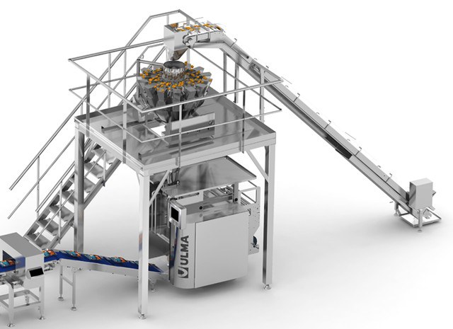 La confezionatrice verticale realizza le confezioni di nuggets in base al dosaggio del prodotto che è alimentato dalla pesatrice multitesta.