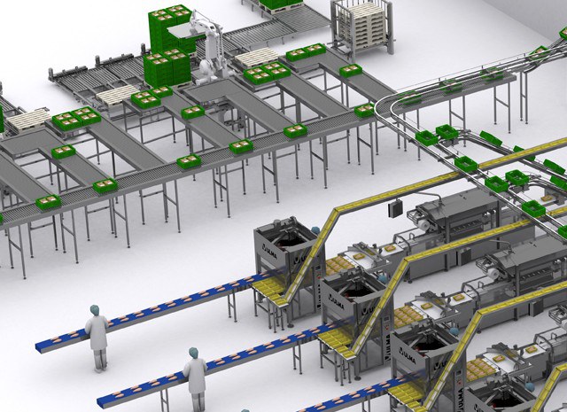 In ogni linea un operatore si incarica di introdurre manualmente le vaschette termosaldate nelle casse di plastica che riceve attraverso le rampe di distribuzione. Successivamente tutte le casse vanno alle due cellule di pallettizzazione che mediante robot antropomorfi realizzano in modo automatico i pallet.