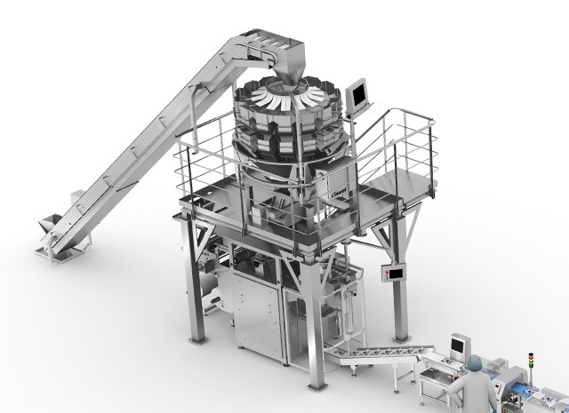 Confezionamento verticale che riceve da una pesatrice multitesta il prodotto da confezionare.