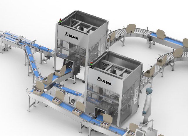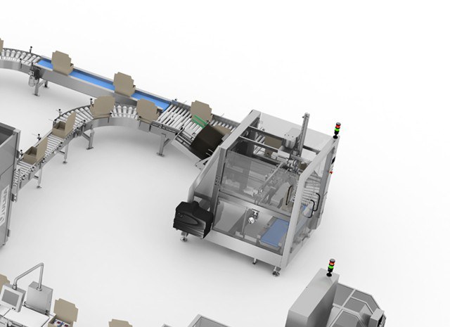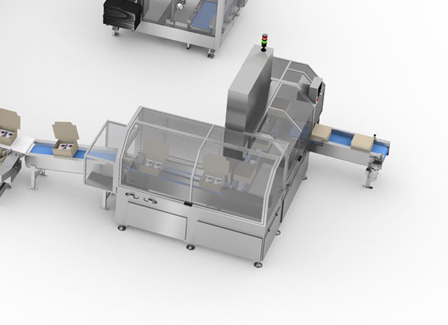 Le cellule di inscatolamento sono dotate di un robot delta e un sistema multiplo di buste. Il robot mediante un sistema del vuoto manipola le confezioni multiple e le introduce nelle casse corrispondenti. Le cellule di inscatolamento sono flessibili visto che consentono di lavorare con le differenti referenze del cliente e realizzare differenti soluzioni di inscatolamento.