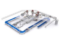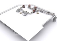 Al piano superiore ci sono due formatrici di casse che le formano e successivamente alimentano il sistema di trasporto e discensori di casse che forniscono il piano inferiore dove sono presenti le confezionatrici.