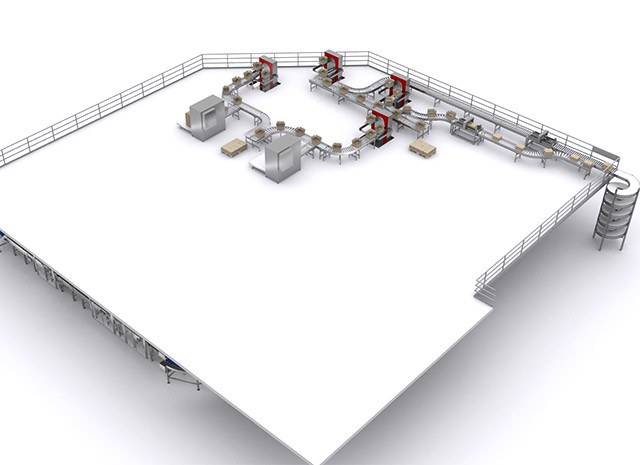 Le casse, una volta piene, vengono sollevate tramite l' ascensore al piano superiore per poi essere chiuse in modo automatico ed essere consegnate attraverso nastri di trasporto e una spirale discendente alla zona di prodotto terminato.